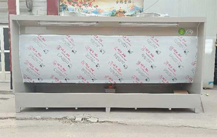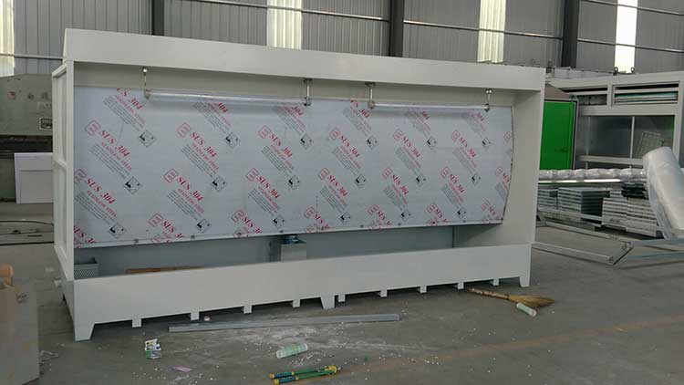 水簾工作時,水泵連續向溢流槽供水,使水溢流,在水簾板上形成瀑布狀的水簾。供風機將空氣從室體頂部將新鮮空氣均勻送入,排風機通過水簾與室體形成的通路從水簾下部將操作區的被污染的空氣吸走,從而保證噴室內空氣循環流動。噴漆時,一部分過噴的漆霧碰到水簾板的水簾上,被水沖走至儲水槽內,沒被捕捉的漆霧隨頂部吹下的氣流經過水簾板下部在漆霧洗滌裝置內與水霧充分混合洗滌,氣流內形成的混合漆霧的較大液滴經擋水板阻擋,絕大部分回到儲水槽內,剩余的廢氣再經活性炭吸附箱充分過濾,潔凈的空氣經排氣管路進入大氣。