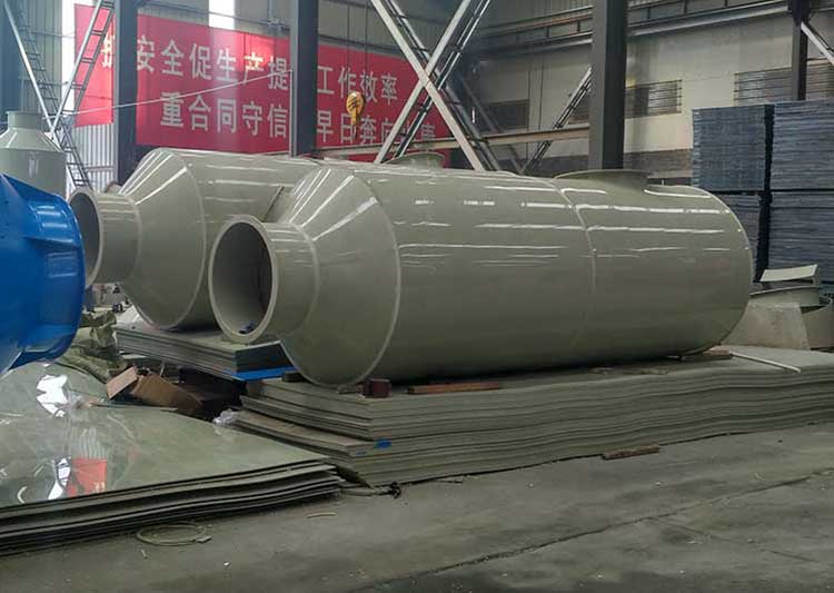 1.5萬風量酸霧凈化塔規格為:ф1.8m*H4.0m*10mm。進、出風口直徑均為600mm。循環水量每小時22立方。每小時處理廢氣量16800立方。凈化塔整體厚度為10mm PP板。