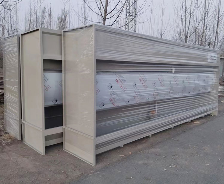 L5.0*W0.9*H2.1(m),面板1.0厚鍍鋅板噴塑,水池1.5mm鍍鋅板噴塑。水簾201不銹鋼。一層噴淋,一層浮球。電控箱一個。水泵一個,風機4臺。