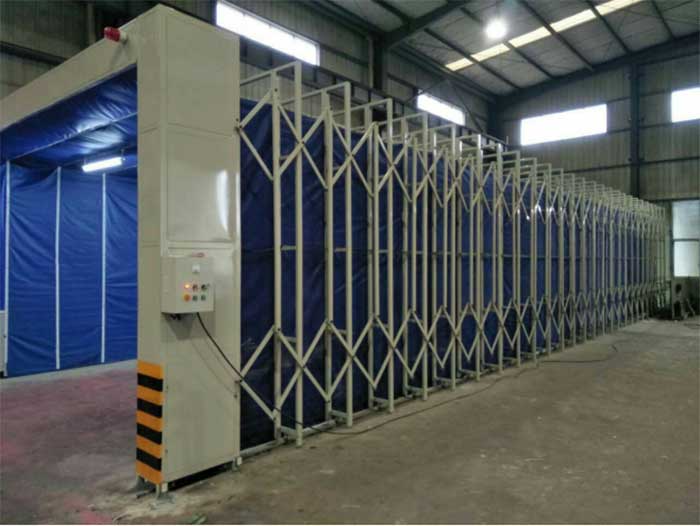 3、伸縮移動噴漆房整體為框架傳動結構,每組框架間均有阻燃PVC布密封連接,安裝快捷、外形美觀,結構精巧,使用方便,制造成本低,節約投資;