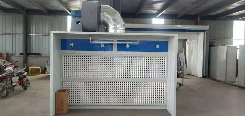 干式噴漆柜主要是把噴工件時多余的漆霧經過風機吸力排出室外,噴漆作業時利用風機的吸力 ,把噴向工件上多余的漆霧通過過濾紙,過濾棉二次凈化后,經漆氣分離裝置,進入活性炭過濾層過濾,將凈化后的氣體排出室外。廢漆去除達到80以上。漆霧與氣混合隨風,經過濾紙,過濾棉過濾,油漆殘渣浮在上面,揮發性氣體亦經過活性炭過濾,從而保持排出室外的氣體清潔,從而完成漆霧凈化目的。