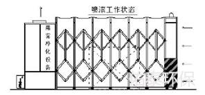 伸縮式無泵水簾噴漆房主要由軌道、移動框架室體、照明系統、電控系統組成。結構示意圖
